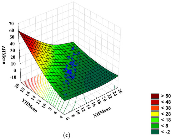 Surface chart 3W of textures RHMean vs. GHMean vs. BHMean from the color space RGB (a), LHMean vs. aHMean vs. bHMean from the color space Lab (b), and XHMean vs. YHMean vs. ZHMean from the color space XYZ (c).