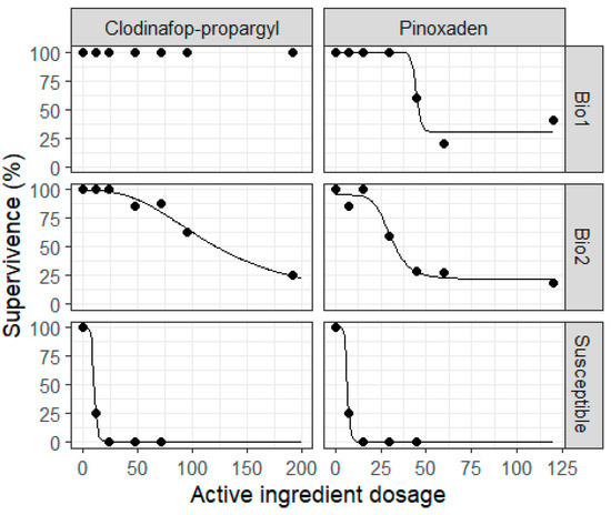 In the preliminary experiment, all individuals from bio 1 and bio 2 survived at twice the field recommended dose, while all susceptible individuals died at half of the field recommended dose. These results implied that the RF of the bio 1 and bio 2 population was greater than four for Clodinafop-propargyl and Pinoxaden.