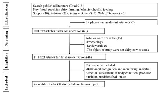 We conducted a mindful scientific literature search. Our goal was to find the latest peer-reviewed papers that not only deal with precision dairy farming but also include behavioral identification, health monitoring, and precise feeding of dairy cattle. The literature search was conducted in four scientific databases: Scopus; PubMed; Science Direct; as well as Web of Science. A systematic approach was adopted to narrow down the search results to papers that are directly related to the scope of precision dairy farming. The initial search started with a broad search equation comprising basic keywords—”precision dairy farming” AND “behavior” AND “health” AND “feeding”—to obtain extended search results. The year of publication was set using a custom range from 2018 to 2023 to ensure the time sensitivity of the topic. The literature was selected based on the criteria mentioned in Figure 1.