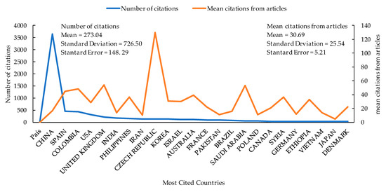 Although China had the highest number of citations, and the mean number of citations per article was 16.60, similar to the top 10 countries with the highest number of research citations. This fact may be associated with the high rate of publications, which contributes to a reduced mean number of citations per article in China, whereas Brazil shows fewer studies on the subject but with a mean number of citations equivalent to China.