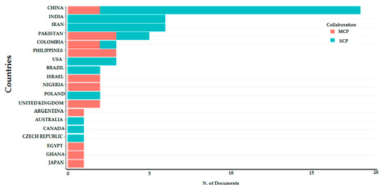 The countries of the corresponding authors and collaboration rate within the country (SCP) and between countries (MCP) are shown in Figure 6. China has a percentage of collaboration between countries of 11.11%, Pakistan has a collaboration percentage of 40%, and Colombia has a collaboration percentage of 66.67%. On the other hand, the other countries only have publications with authors from their respective countries (Figure 6).