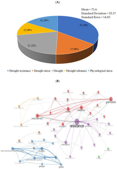 Most relevant keywords (A) and keyword co-occurrence network (B) with regard to advances in breeding for drought stress.