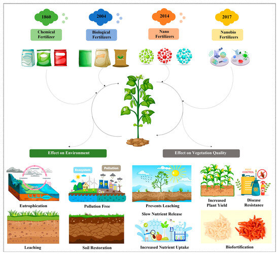 Another approach that is being looked after these days is a combination of biofertilizers with nanoparticles to give rise to nano-biofertilizers. Nano-biofertilizers represent a convergence of nanotechnology and biotechnology in agriculture. At their core, these innovative fertilizers consist of nanoscale materials intricately linked with beneficial microorganisms. The objective is twofold: to enhance nutrient uptake by plants and to reduce the ecological footprint of farming practices. The nano-biofertilizer could be any plant growth-promoting factor entrapped in nanoparticles or it can be bacterial cells adhered on the nanoparticles’ surface. Although nano-biofertilizers have been synthesized using multiple approaches, an in-depth understanding of their interaction with soil microbiota, soil components, plants, and endophytes is lacking, especially at the molecular level [9]. Since nano-biofertilizers are required in small quantities compared to other types of fertilizers, their utility for improving crop productivity, biofortification, and resistance to abiotic and biotic stresses is very promising, considering the goal of sustainable agriculture. The imperative, therefore, is to optimize nutrient management while minimizing environmental harm. In this review, the evolution from chemical fertilizers to the development of nano-biofertilizers (Figure 1) as a sustainable solution for agricultural growth and environmentally friendly technology with reference to their efficiency, use in crop plants, dosages, cost, and as a future fertilizer are discussed.