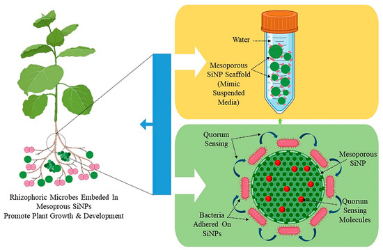 Three crucial steps are involved in the preparation of a nano-biofertilizer: (1) microbial culture preparation, (2) encapsulation with nanoparticles, and (3) testing its efficacy, quality, and shelf life [94]. Its production entails combining PGPR suspension with sodium alginate, starch, and bentonite followed by cross-linking with calcium chloride [95]. Nano-biofertilizers have also been created using salicylic acid and nanoparticles. This approach involves combining the biofertilizer with sodium alginate, ZnONPs, and salicylic acid followed by the addition of calcium chloride [94]. A nanosilica hybrid scaffold is used as part of the nano-biofertilizer for plant growth promotion. A mesoporous nanosilica scaffold (MNS) impregnated with minimal media acts as suspended media for the growth and colonization of bacteria and increases its shelf life. The MNS will decrease steric hindrance and cause an increase in the lag phase of bacterial growth, consequently delaying the exponential phase by the slow release of nutrients to bacterial colonies adhered to them. The MNS not only provides nutrients to bacteria for a longer duration but also provides the bacteria with a surface to adhere to, which in turn starts its colonization by releasing quorum sensing molecules, i.e., acyl-homoserine lactones (HSL) (Figure 2). Quorum sensing is a known phenomenon in bacterial strains used in PGP activity [96]. Quorum-sensing molecules (QSMs) facilitate the expression of genes which are dependent on the cell population compactness in gram-negative bacteria. They help in cell-to-cell communication in a bacterial population and enable cellular adaptation to varying environmental conditions. QSMs help maintain the viability of bacteria in MSS media. The organic waste from plants, animals, and even food, in combination with nanoparticles, can be used to make a potent nano-biofertilizer that improves soil fertility and plant growth. The organic waste is broken down into little bits, rinsed with water to eliminate contaminants, and then either pyrolyzed or allowed to decompose. To create a nano-biofertilizer, this partially degraded or pyrolyzed waste is mixed with nanoparticles [67].