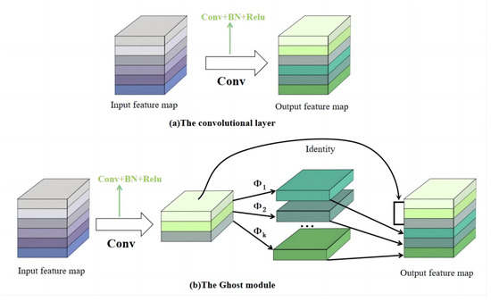 Traditional convolutional network modules have many parameters and computations, which is a huge challenge for hardware devices, often exceeding memory limitations and leading to slower training and inference in deep networks, making them difficult to deploy in resource-constrained edge devices. GhostNet [22] is a lightweight network proposed in 2020 to address the redundancy problem of the feature map similarity between them and obtain more feature information through cheap operations to achieve efficient feature extraction in lightweight networks. The core contribution of GhostNet is the Ghost module, whose main idea is to achieve efficient feature transformation by dividing the traditional convolution into two steps. The first step is to perform a simple convolution operation on the input feature map to obtain a part of the feature map, then to perform a cheap operation on this part of the feature map to obtain another part of the feature map, stitching the two parts of the feature map, and finally to perform the dimensionality transformations. This design allows the Ghost module to capture the features of the image adequately while improving computational efficiency. The flow of ordinary convolution and Ghost convolution is shown in Figure 3, where represents the cheap operation [23].
