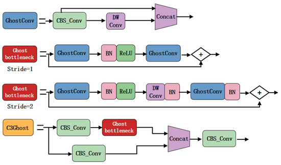 The correlation between the effects of Ghost module parameter compression and computational acceleration and the number of transformations s is evident. To balance speed and accuracy, the number of transformations is set to 1/2, resulting in some acceleration while maintaining detection accuracy up to an extent. As Figure 4 illustrates, the Ghostconv module and C3Ghost module are constructed based on this basis. DwConv is a deep separable convolution, serving as one of them. The Ghostbottleneck module establishes a deep network structure with two step sizes 1 and 2 settings.
