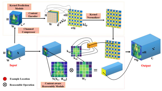 The upsampling operation extends the low-resolution feature maps of an image to higher resolutions, combines the feature maps of various resolutions, helps the network to capture multiscale information at different levels, and enhances the sensory field and the representation capability of the network, ultimately increasing the model’s ability to locate the target. Currently, the standard upsampling methods used are interpolation upsampling and inverse convolutional upsampling techniques. Interpolation-based upsampling is categorized into two types—nearest neighbor and bilinear; however, the nearest neighbor interpolation leads to block artifacts in the image and fails to deal with small texture details, and bilinear interpolation smooths the image during upsampling, resulting in the loss of key details and blurring of the image edges, ultimately performing poorly during image reconstruction and semantic segmentation tasks. Inverse convolutional upsampling necessitates more considerable learning parameters that may lead to a more complex network model. Unfortunately, such a complex model is prone to overfitting and unsuitable for lightweight models [25]. To address the abovementioned issues, this study has proposed a CARAFE [26] lightweight upsampling module that replaces the original network’s upsampling structure, expands the model’s sensory field, adapts to the input content, and aims to improve its performance. Please refer to Figure 5 for the specific flowchart.