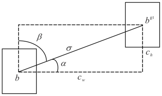 The loss function measures the error between the model prediction and the true label. During the training process, it is continuously optimized to minimize the differences and improve the model’s performance. In YOLOv5s, the default loss function for bounding box localization is CIoU [28]. It considers the intersection, centroid, and diagonal distance of the predicted and real boxes, making it a comprehensive and accurate loss function for target detection. However, it does not consider the directional mismatch between the real and predicted boxes, which can affect the model’s convergence speed and detection accuracy. To solve this problem, SIoU [29] includes the vector angle as a penalty term in the loss function, ensuring that predicted frames match the real frames more closely. This improvement enhances accuracy and speeds up the training process. Figure 6 shows SIoU’s angular costing.