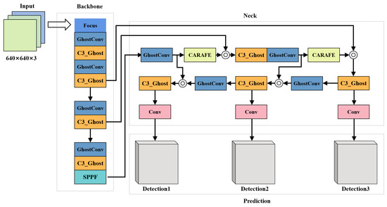 Combined with the above, this paper proposes an improved model GCSS-YOLOv5s. Firstly, the CBS_Conv in the original network is replaced by Ghostconv, and the C3 module is replaced by C3Ghost module, which greatly reduces the number of parameters and computational overhead of the model; secondly, the CARAFE up-sampling is used to replace the original nearest neighbor interpolation up-sampling module of the network, which improves the sensory field of the model, and helps the model to obtain the multiscale information of the pest characteristics. Then the CIoU loss function is replaced by SIoU loss function in the model, which improves the convergence speed and detection accuracy of the model. Finally, Soft-NMS is adopted as the post-processing technique of the model, which enhances the model’s ability of recognizing overlapping pests. Figure 7 shows the structure of the improved model.