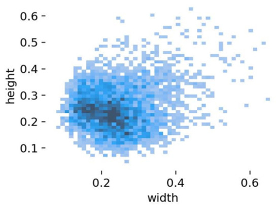 Rectangular bounding boxes were drawn around pests present in each image using the open-source image annotation tool labeling. Category labels were assigned to each box to facilitate the learning process of the algorithmic model. The dataset is divided into three parts: the training, validation, and test sets. There are 4786 images in the training set, 530 in the validation set, and 1326 in the test set. The training set is primarily used for extracting data features and building the model. The validation set determines hyperparameters, network structure, and other aspects of the model to enhance its generalization ability and robustness. The test set is the final dataset used to verify the model’s accuracy before its release and to evaluate the model’s generalization ability. The training set data are the central component of algorithmic model learning. It contains a statistical plot of the height-to-width ratio of the pest’s rectangular bounding box relative to the entire image, as illustrated in Figure 8. The darker the color means there are more pest targets at that location.