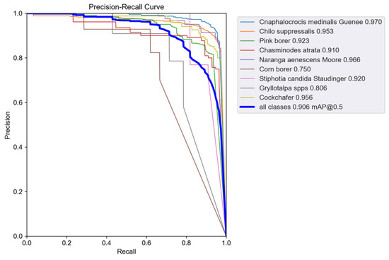 Figure 9 shows the P–R curves of the enhanced model. The detection mean average precision (mAP) values of seven pests were over 90%, among which Cnaphalocrocis medinalis Guenee, Chilo suppressalis, Naranga aenescens Moore, and Cockchafer even exceeded 95%. This fully proves the effectiveness of this improved model for pest detection.