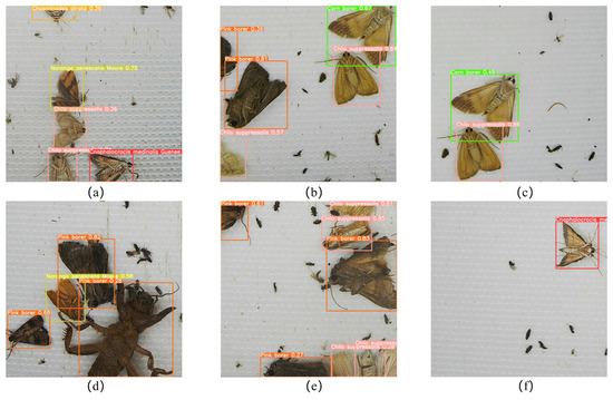 (a–f) Effectiveness of the improved algorithm for pest detection.