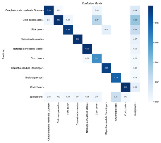 To explore the improvement of the algorithm, this paper introduces the confusion matrix to analyze the model’s performance. It provides detailed information about the classification results and aids in understanding the model’s performance. Figure 11 shows seven categories of pests with more than 90% accuracy classified, whereas Corn borer and Gryllotalpa spps. have lower accuracy. Among these, there was a 29% probability of misclassifying Corn borer as Chilo suppressalis and a 21% probability of Gryllotalpa spps. being misclassified as the background, leading to missed detection. According to our analysis, the reason for this is that Corn borer, Gryllotalpa spps. acquired a limited amount of data in this model training, the model does not have enough examples to learn its features, the model will be more inclined to predict the category with more samples, and the amount of data should be increased to improve the model. Overall, the improved model in this paper has far-reaching implications for resource efficiency and scalability in pest detection applications, although there is a 0.6% accuracy reduction relative to the original model; however, this small performance drop is reasonable and acceptable relative to the huge reduction in the number of parameters and computational resources.