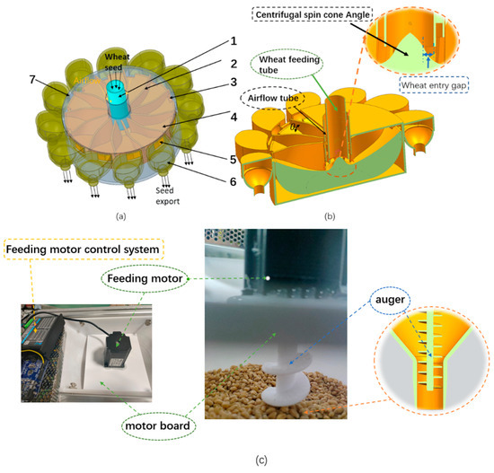 Structure of the centrifugal wheat strip seeding device and seed feeding device: (a) is a perspective view, where 1—seed feed tube; 2—dip guide strip; 3—seed outlet notch; 4—centrifugal concave plate; 5—shell outlet; 6—inoculation capsule; 7—shell; (b) is a sectional view; (c) is a seed feeding device.