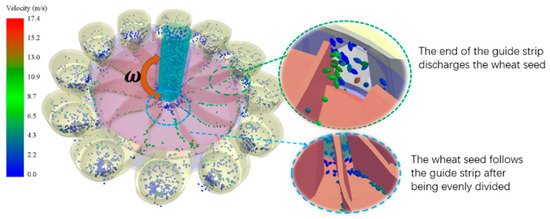 The structure of the centrifugal wheat strip seeding device is shown in Figure 1. This device consists of seed feed tubes, centrifugal concave plates, dip guide strips, seed discharge notches, a shell, shell outlets, and inoculation capsules. Among them, the dip guides make an angle of θ with the centrifugal concave plate. There is an airflow channel outside seed feed tube, and the centrifugal concave plate rotates to create a negative pressure inside seed discharger. When the seeding device works, the seed flows from the seed box into the seed feed tube and is then accelerated under the effect of gravity and negative pressure to fall onto the centrifugal concave plate in the cone angle for seed distribution. Seeds in the cone angle are evenly distributed and accelerated away from the wheat seed feed gap between seed tube and cone angle by the combined effect of the support force of guide strips and concave plate and airflow drag force. At the end of the centrifugal concave plate set seed notch, with the fluid phase of the forces, the ends of guide strips on the seed support force seeds through the shell outlet into the inoculation capsule. The seed decelerates and relieves pressure in the inoculation capsule and leaves the seed dispenser after the direction changes toward the ground, completing a uniform 12-row row. The CFD–DEM coupled [16,17,18,19] simulation simulates the movement of seeds during the seed discharge work, as shown in Figure 2.