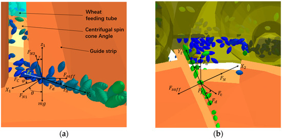 Wheat seed particles rise along the guide strip on the centrifugal concave plate due to gas-phase drag force, centrifugal force, and Saffman lift. After reaching the notch area of the seed discharge device, the gas flow rate decreases because of the pressure relief and deceleration effect of the inoculation capsule. At this time, the gas-phase resistance is in the opposite direction to the movement of the seed particles. The end of the guide is bent in the opposite direction of rotation to provide outward support to the seed, as shown in Figure 3b, and the forces in all directions on the seed particles are: