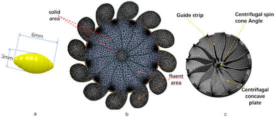 CFD model grid and DEM model of wheat seeds: (a) wheat seed modeling in EDEM; (b) FLUENT delineation of the model grid; (c) dynamic mesh through UDF-driven centrifugal concave plate and dip angle guide strip.