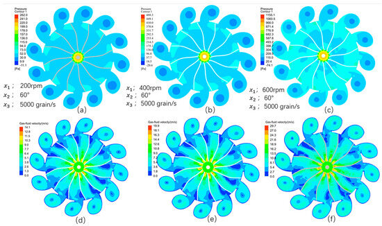 Flow velocity and pressure plots of the coupled CFD–DEM flow field: (a,d) for the 200 rpm condition; (b,e) for the 400 rpm condition; (c,f) for the 600 rpm condition.