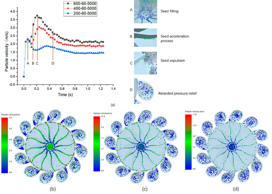 CFD–DEM coupled seed distribution and seed velocity: (a) shows the variation of seed velocity under each condition, where A, B, C, and D are the four stages of the seed discharging process, respectively; (b–d) are the simulation results of seed distribution in the seed discharger under the rotational speeds of 200 rpm, 400 rpm, and 600 rpm, respectively.
