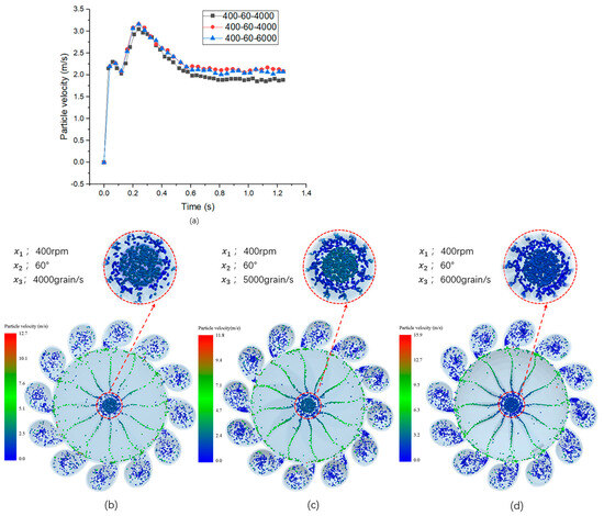 CFD–DEM coupling of seed distribution and seed velocity: (a) shows the variation of seed velocity under each condition; (b–d) are the simulation results of seed distribution in the seed discharger under the seed feed rate of 4000 grains/s, 5000 grains/s, and 6000 grains/s, respectively.
