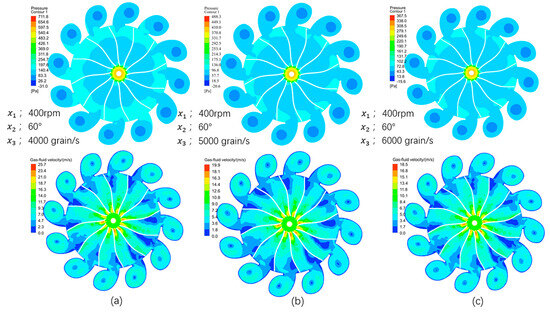 CFD–DEM coupled velocity and pressure maps of flow field: (a) velocity and pressure cloud of the flow field for a feed rate of 4000 grains/s; (b) velocity and pressure cloud of flow field for a feed rate of 5000 grains/s; (c) velocity and pressure cloud of flow field for a feed rate of 4000 grains/s.