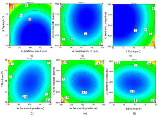 The two-dimensional contour plots were plotted by Design-Expert to co-ordinate and analyze the pattern and degree of influence for rotational speed, guide strip dip angle, and seed feed rate on CVSU and RSCV (e.g., Figure 9). It can be seen from (a), (b), (d), and (e) that the increase in RPM favors the decrease in both metrics, and the CVSU reaches the optimal solution region in preference to the RSCV, but both metrics increase as the RPM continues to increase. As the guide strip dip angle increased, the CVSU was in an upward trend, and the RSCV showed a decreasing and then increasing trend as shown in Figure 9a,c,d,f.