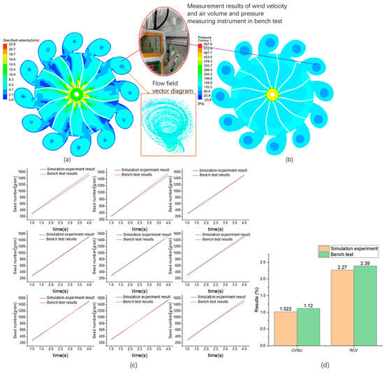Comparison of flow rate graphs, pressure graphs, experimental results, and bench experiment results of simulation under optimal parameter conditions: (a) flow rate graphs; (b) pressure graphs; (c) comparison of simulation experiments and bench experiments in terms of seed yield; (d) comparison of simulation experiments and bench experiment results for CVSU, RSCV.