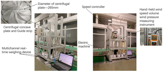 To verify the accuracy of optimized simulation results, a centrifugal concave plate with 69° tilted guide strips was printed by a 3D printer for bench-top experiments. The bench experiment is shown in Figure 11. The bench experiment was unable to show the internal flow field, so the simulation results were verified by measuring the flow velocity and pressure at the center of the inoculation capsule utilizing a hand-held wind speed, volume, and pressure measuring instrument. Because of the shielding of tilting guide strips, it was not possible to collect seed distribution shapes at the same time by the high-speed camera, so the choice was made to collect the real-time seed yield results from 12 ports through multiple real-time weighing devices to compare with the simulation results. Nine groups with large differences were selected from the CFD–DEM coupled simulation results of optimal values and the bench experiment results, as shown in Figure 10c. Comparing the seed yield of the simulation experiment, the evaluation index is shown in Figure 10d. The experimental results show that the flow field effect of the bench experiment was consistent with that of simulation experiment, and the difference between the number of seeds collected by the multichannel real-time weighing device and the simulation seed discharge effect was small. Due to the large radius of the centrifugal concave plate (265 mm), the slight shaking of the bench at high speeds affects the perpendicularity between the motor and centrifugal concave plate, which ultimately affects the seed discharging effect.