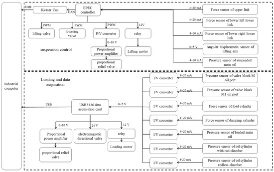 The hardware of the measurement and control system of the tractor electro-hydraulic-suspension tillage-depth and loading-control system test bench was mainly composed of three parts: industrial computer, suspension control system, and loading and data-acquisition system, as shown in Figure 3. Among them, the suspension control system mainly controls the tillage depth through the controller to control the lifting or lowering valve; the data-acquisition system realizes the acquisition and recording of the sensor signal, as well as the on–off and size control of the loading force through the electromagnetic directional valve and the electro-hydraulic proportional relief valve; and the industrial computer realizes the input of the operation panel and the monitoring of the test-bench data by building a human–computer interaction interface.