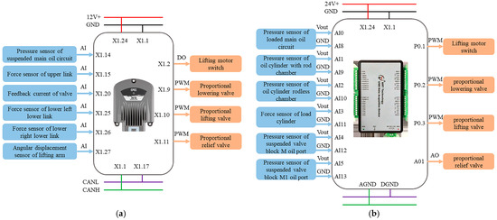 (1) EPEC3610 controller. The EPEC3610 produced by the Finnish company was selected as the controller of the test bench. The feedback signal processing of the suspension system sensor and the operation of the control strategy are completed in the control system, and the output control signal is controlled by the electro-hydraulic proportional valve to drive the lifting cylinder to perform the action. The controller has 22 I/O pins, the power supply voltage is AC 12 V, and the system I/O pin address allocation is shown in Figure 4a.