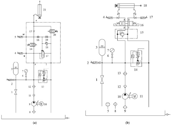 Hydraulic system diagram. (a) Suspension hydraulic system; (b) Loading hydraulic system. The hydraulic components represented by the serial number.