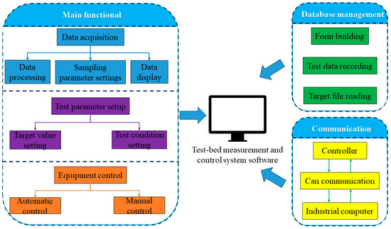 The measurement and control system software of the test bench runs in the industrial computer. The software design mainly includes the main functional modules of the system, database management module and communication module. The main functional modules include data-acquisition function, test parameter setting function and equipment control function. Among them, the data-acquisition function includes the setting of acquisition parameters, data processing and data display. The test parameter setting function includes parameter target value setting and test condition setting. The equipment control functions include the automatic control and manual control of the suspension and loading of the test bench. The database management module includes the recording of test data and the reading of target value files. The communication module is mainly the CAN communication between the industrial computer and the controller, so as to realize the mutual transmission of signals. The software design schematic diagram of the measurement and control system is shown in Figure 6.