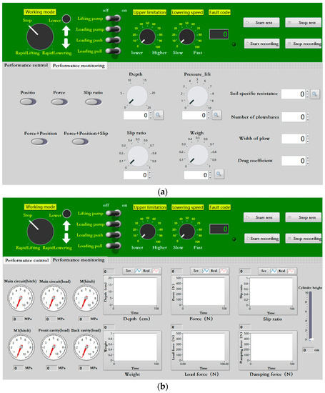 Based on the host computer, the virtual instrument operation panel of the test bench was developed. The buttons, switches and display windows on the panel are convenient for the operation of the test bench and the observation of real-time monitoring signals. The operation panel is shown in Figure 7. The whole operation panel was composed of three parts: the main interface, performance control interface and performance monitoring interface. The main interface mainly includes the start and stop of the test, the recording of the test data, the selection of the working mode, the monitoring of the signal communication of the test bench, the start and stop of the lifting pump and the loading pump, the on–off of the loading force of the loading cylinder, the limit of the lifting height, the adjustment of the descending speed, and the display of the fault code. The performance control interface mainly includes the selection of tillage-depth control method, the input of the control target signal and the simulation of working condition signals, such as working soil and farm tool parameters. The performance monitoring interface displays the relevant state signals of the test bench in real time, mainly including the oil pressure signal, tillage-depth signal, traction signal, loading force signal and slip rate signal of the suspension system and loading system.