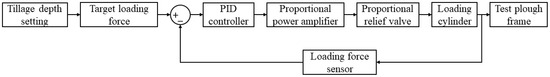 In order to realize the continuous adjustment of the tractor-ploughed soil resistance during the operation of the test bench by the measurement and control system to simulate the resistance change in the actual operating conditions, a test-bench loading-control system based on PID was designed. The block diagram of the loading-control system is shown in Figure 8. When the test bench is working, the target tillage depth is set through the human–computer interaction interface, and the set target tillage depth is converted into the corresponding target loading force based on the selected parameters of the ploughing operation conditions. The loading cylinder force sensor feeds back the difference between the actual loading force and the target value into the PID controller to calculate the control amount. The proportional power amplifier drives the proportional relief valve to adjust the oil pressure of the loading system, so as to promote the loading cylinder to realize the control of the loading force.