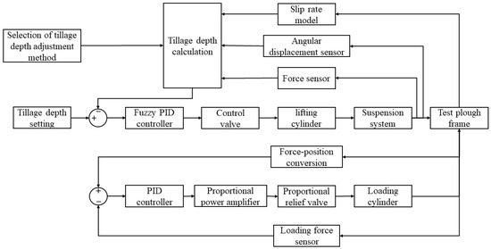 In order for the measurement and control system to control the tillage depth during the operation of the test bench, a test-bench suspension-control system based on fuzzy PID was designed. The block diagram of the suspension-control system is shown in Figure 9. When the test bench is working, the target tillage depth is set through the human–computer interaction interface, and the corresponding tillage-depth adjustment method is selected. On the one hand, based on the selected tillage-depth adjustment method, the controller calculates the tillage-depth control amount according to the input target value and the feedback signal of the angular displacement sensor, the force sensor and the slip rate model, so as to drive the flow of the tillage-depth control valve to control the system flow, thus promoting the lifting cylinder to realize the control of the tillage depth. On the other hand, the actual tillage depth obtained by the angular displacement sensor is fed back to the loading-control system to calculate the target loading force. The loading-control system changes the size of the loading force in real time according to the change in the tillage depth and realizes the simulation of the working resistance during the operation.