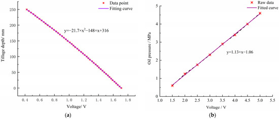 In the actual operation process, it is difficult to measure the tillage depth of farm tools directly, so the indirect measurement method was adopted. The test bench feeds back the tillage-depth signal through the angular displacement sensor installed at the lifting arm position. Therefore, it is necessary to calibrate the relationship between the measured value of the angular displacement sensor and the actual tillage depth. When calibrating, the position of the lower limit of the lifting arm was taken as the starting point, corresponding to the position of the deepest tillage depth; with 3 mm tillage depth as the interval, the experiment was repeated many times, and the output voltage of the sensor at different positions was recorded. The result is shown in Figure 12a.