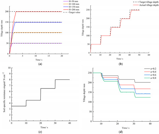 The results of tillage-depth control test. (a) Position control of fixed target; (b) Position control of variable target; (c) Soil-specific resistance; (d) Draft-position integrated control.