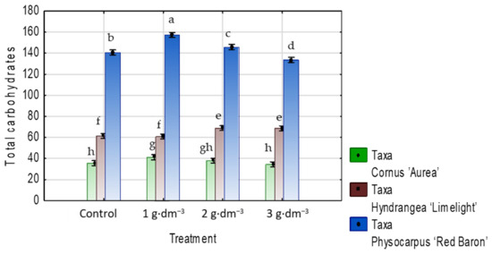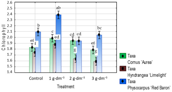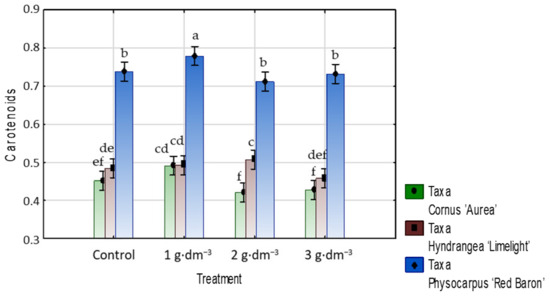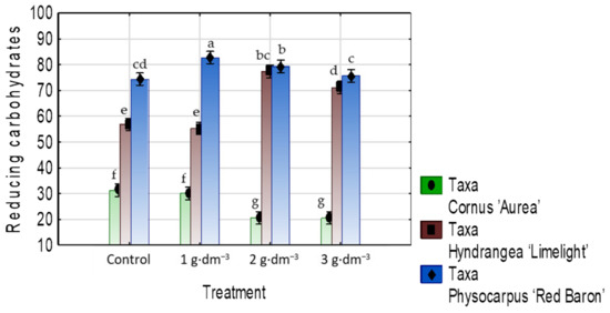 | Variable Cornus ‘Aurea’ | Mean | SD | Chlorophylls | Carotenoids | Total Carbohydrates | Reducing Carbohydrates |