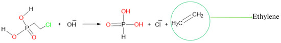 Chemical structure equation depicting the breakdown of ethephon and the release of ethylene.