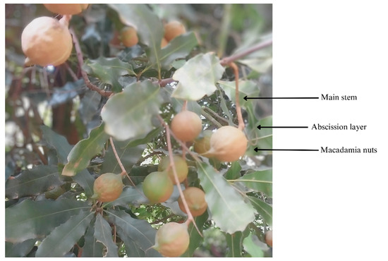 Macadamia nut cultivars ‘Beaumont’ and ‘788’ were harvested from Fyvie estates, uMlaas Road, Camperdown, KwaZulu-Natal, South Africa (latitude: 29°47′50.3″ S, longitude: 30°27′54″ E). Line 86–94 ‘The area is characterized by well-drained sandy loam soil, and a range of cultural practices have been implemented to optimize macadamia nut production. These practices encompass drip irrigation for maintaining consistent moisture levels, customized fertilization based on annual soil testing, integrated pest management techniques, regular pruning aimed at enhancing canopy structure and air circulation, careful harvesting at the ideal stage of maturity, and precise application of ethephon to specific macadamia trees to facilitate abscission. Ethylene was administered as ethephon on physiologically mature nuts, serving as a vital plant growth regulator to facilitate nut abscission in macadamia trees [14] (Figure 2). The concentration of ethephon was determined in accordance with industry standards. For ‘788’ macadamia trees, 4 L of ethephon 480 SL per hectare was mixed with 3000 L of water per hectare, resulting in a concentration of 13.33 mL/L. ‘Beaumont’ macadamia trees received a dosage of 5 L of ethephon 480 SL per hectare combined with 3000 L of water per hectare, resulting in a concentration of 16.67 mL/L. Both doses were applied using a Cima mist blower to promote nut abscission. The application of ethephon specifically targeted physiologically mature nuts, and those that naturally detached and fell to the ground were considered successfully abscised nuts.