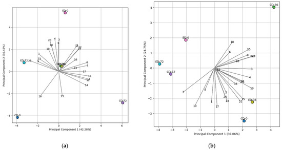 The biplot of Principal Component 1 (PC1) versus Principal Component 2 (PC2) illustrates the relationship between fatty acids and different treatments for (a) ’Beaumont’ and (b) ‘788’ cultivars during storage. The treatments are denoted as CD for control drop and ED for ethephon drop, and the storage days are represented as 0, 36, and 72. Specific numerical representations were assigned to various fatty acid components for clarity and ease of reference. These numerical assignments are as follows: 1 represents C12, 2 represents C14, 3 represents C15, 4 represents C16, 5 represents C16:1, 6 represents C17, 7 represents C18, 8 represents C18:1 (cis), 9 represents C18:2 (cis), 10 represents C20, 11 represents C20:1 + C18:3n3, 12 represents C21, 13 represents C22, 14 represents C20:3n3 + C22:1, 15 represents C20:4n6, 16 represents C23, 17 represents C24, 18 represents PUFA (polyunsaturated fatty acid), 19 represents SFA (saturated fatty acid), 20 represents PUFA:SFA, 21 represents TFA = ∑ (Sum of all fatty acids), 22 represents Omega-6 (n−6), 23 represents Omega-3 (n−3), and 24 represents ∑ n−6)/(∑ n−3).