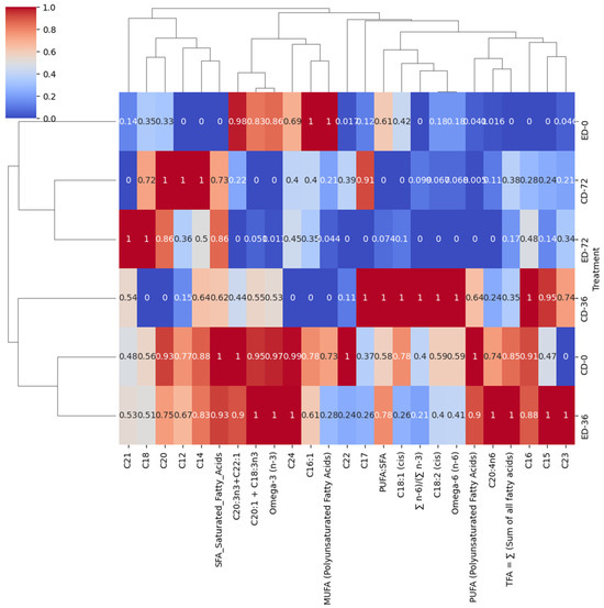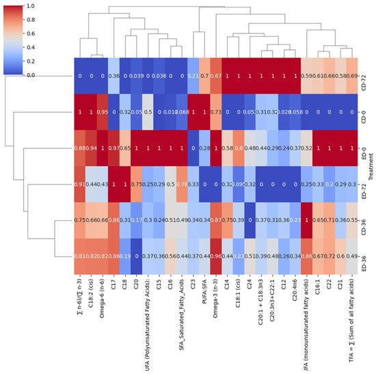 In the ‘Beaumont’ cultivar, at the end of the storage period, there was a significant positive correlation (0.78) between SFAs and ED-72, while a negative correlation (0.25) was observed between SFAs and PUFAs. As a result, there was a negative correlation (0) between ED-72 and the PUFA:SFA ratio. This negative correlation indicates that the application of ethylene treatment resulted in a reduction in the ratio of polyunsaturated fatty acids to saturated fatty acids. This decrease can be attributed to the increase in SFA levels, which, in turn, led to a decrease in the overall proportion of polyunsaturated fatty acids. Polyunsaturated fatty acids, namely eicosatrienoic acid + alpha-linolenic, eicosatrienoic acid + erucic acid, and arachidonic acid, were strongly correlated (1) with CD-72. Oleic acid, one of the most abundant MUFAs in macadamia nuts [4,18], was also strongly correlated (1) with CD-72, while SFAs, namely myristic acid, lauric acid, and tetracosanoic acid, were strongly correlated (1) with CD-72 and stearic acid (18:0), heptadecanoic acid (C17:0), and arachidic acid (C20:0) exhibited a strong positive correlation of 1 with ED-72 (Figure 4). Moreover, the (∑ n−6)/(∑ n−3) was strongly correlated (0.91) with ED-72; this is similar to the observation from PCA analysis.