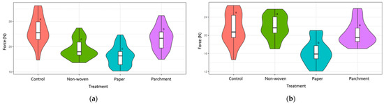 Boxplot of the compression force (N) after application of bagging treatments (control, paper, parchment, and non-woven) on grape clusters. In the left panel (a) are the ‘Italia’ treatments and in the right panel the ‘Vittoria’ treatments (b). An ANOVA one-way analysis was carried out, combined with a Tukey’s honest significant difference (HSD) test to generate compact letters (p-value ≤ 0.01, for both cultivars).