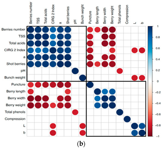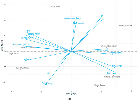 The PCA revealed treatment differences between the two cultivars. A large difference was observed between the two controls vs. the various treatments. Principal component 1 (Dim 1, 60.9% total variance) was related to berry morphological values. Colorimetric properties, expressed as L* and b*, together with bunch weight, dominated in principal component 2 (Dim 2, 18.5% total variance), displaying itself as the most influential component in determining the variance between control and treatments in both cultivars (Figure 2a). As expected, the correlation results (Figure 2b) show that all the highest correlation variables were those associated with the morphological analyses of the berries: positive correlations were found for berry length, berry width and berry weight, and these same variables were negatively correlated with berry number and shot berries. The berry-number and shot-berry-number variables correlated negatively with the puncture test values.