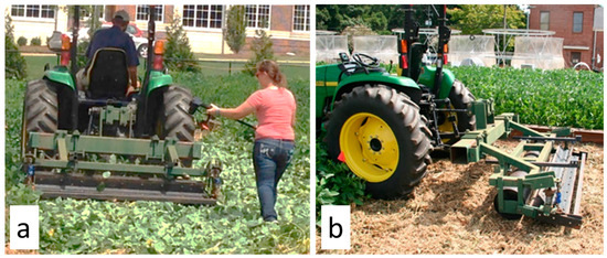 (a) Rear view of the two-stage roller/crimper developed and patented at the USDA-ARS, National Soil Dynamics Laboratory in Auburn, Alabama, terminating iron clay peas during the 2015 growing season; (b) side view of the 2-stage roller/crimper mounted on the John Deere 4710 tractor.