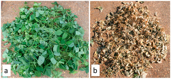 (a) Fresh-cut iron clay pea sample at 0% termination rate. (b) Fully desiccated iron clay peas at ~100% termination rate.