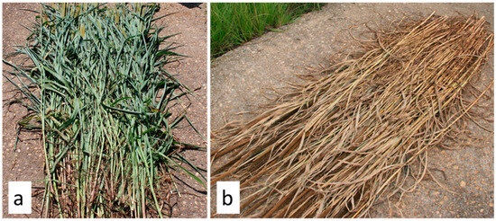 (a) Fresh-cut pearl millet sample at 0% termination rate. (b) Fully desiccated pearl millet at ~100% termination rate.