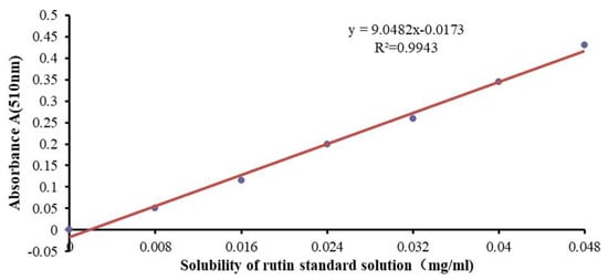 Referring to Yang et al.’s method [28], initially, 20 mg of the rutin standard was mixed with 60% ethanol, and dissolved in a water bath at a temperature lower than 60 °C. The above mixture was then added to a 100 mL volumetric flask, allowed to cool, and set aside while preparing a 0.2 g/L rutin standard solution. Then, 10 mL volumetric flasks were filled with a range of rutin standard volumes (0, 0.4, 0.8, 1.2, 1.6, 2.0, or 2.4 mL). The aluminum nitrate method was used to establish a linear regression equation for these standard samples.