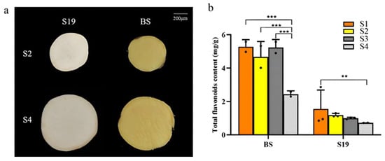 (a) Phenotypic characteristics of S19-S2, S19-S4, BS-S2, and BS-S4 storage root samples. (b) Total flavonoid content in prepared samples from BS and S19 cultivars. *** p < 0.001, ** p < 0.01.
