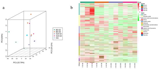 Principal Component Analysis (PCA) is a statistical technique that uses several principal components to reveal the overall metabolic differences between groups, as well as the variability between the samples within each group. In this study, two principal components, PC1 and PC2, were extracted, accounting for 32.78% and 16.11% of the total variance, respectively. There was clear separation of the two samples in the PCA score plot (Figure 3a). Cluster heatmaps were further employed to assess the metabolite profiles in these samples, revealing clear clustering among these biological replicates consistent with a high degree of reliability. Flavonoid metabolite analyses additionally revealed higher overall levels of these metabolites in the BS samples compared to the S19 samples, in line with the total flavonoid content results shown above (Figure 3b). OPLS-DA models were next used to further examine metabolite abundance variations among samples based on the filtering of any orthogonal metabolite changes not related to variable classification, thereby maximizing the differences between sample groups to better detect divergent metabolites. Pairwise comparisons between the S19-S2, BS-S2, S19-S4, and BS-S4 samples were performed using the OPLS-DA model to detect differing metabolites among groups (Figure S1), yielding the following model quality parameters indicative of successful modeling: R2X = 0.738, Q2 = 0.953, R2Y = 0.996; R2X = 0.0.688, Q2 = 0.955, R2Y = 0.996. These results were also validated through 200 permutation analyses (Figure S2). Overall, these analyses collectively demonstrated the substantial differences between the samples, together with the strong similarity of the biological replicates and overall good sample repeatability within the study.